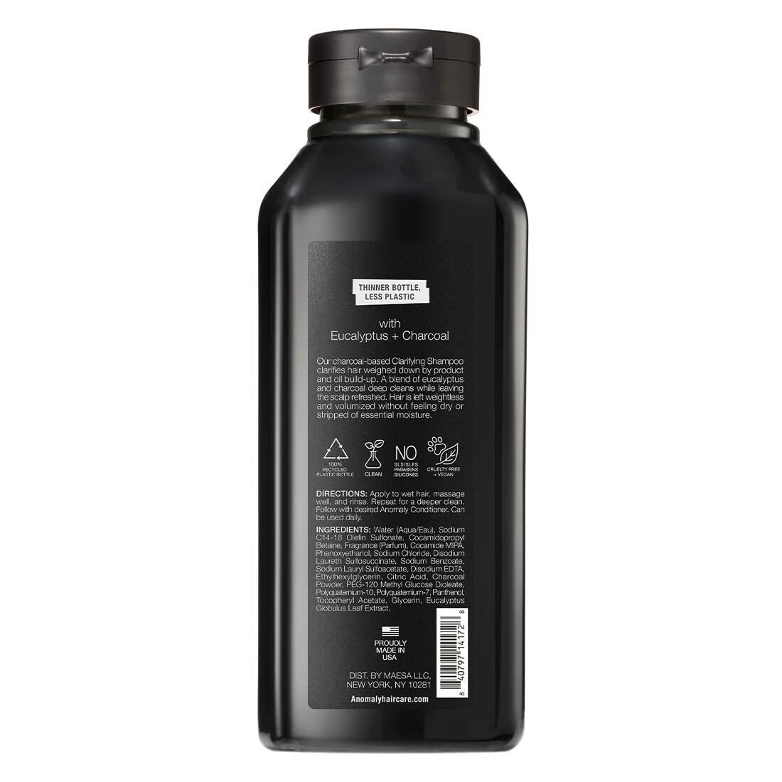 Earth Conscious It can be time-consuming (and confusing!) to find the right products for your hair. We made the edit easy with a less-is-more approach. Each of our products gets our clean stamp of approval, meaning they won't contain parabens, SLS/SLES sulfates, mineral oil, phthalates, or gluten. Bottles Made From 100% Plastic Trash We utilize 100% plastic trash in our bottles and infinitely recyclable aluminum in our cans. Not only will you look good, but you can feel good about what you're putting on your scalp and hair. For us, sustainability isn't just a buzzword. We use recycled plastic in our bottles and tubes, as well as recyclable aluminum for our cans. Our Earth-conscious packaging means our bottles are designed to be as thin as possible. When 91%1 of plastic in the world isn't recycled, we're doing our part in limiting the amount of new plastic that ends up in our landfills and oceans. Our Clarifying Shampoo helps remove product build-up (pollution, oil, dry shampoo, etc.) while cleansing the scalp and keeping moisture locked in. WATER (AQUA/EAU), SODIUM C14-16 OLEFIN SULFONATE, COCAMIDOPROPYL BETAINE, FRAGRANCE (PARFUM), COCAMIDE MIPA, PHENOXYETHANOL, SODIUM CHLORIDE, DISODIUM LAURETH SULFOSUCCINATE, SODIUM BENZOATE, SODIUM LAURYL SULFOACETATE, DISODIUM EDTA, ETHYLHEXYLGLYCERIN, CITRIC ACID, CHARCOAL POWDER, PEG-120 METHYL GLUCOSE DIOLEATE, POLYQUATERNIUM-10, POLYQUATERNIUM-7, PANTHENOL, TOCOPHERYL ACETATE, GLYCERIN, EUCALYPTUS GLOBULUS LEAF EXTRACT Apply to wet hair, massage well, rinse, and repeat if needed. Follow with desired Anomaly Conditioner. Can be used daily. Charcoal Helps remove oil, dirt, and product build-up without damaging the hair shaft itself. Eucalyptus Helps invigorate hair follicles and soothe itchy scalp.