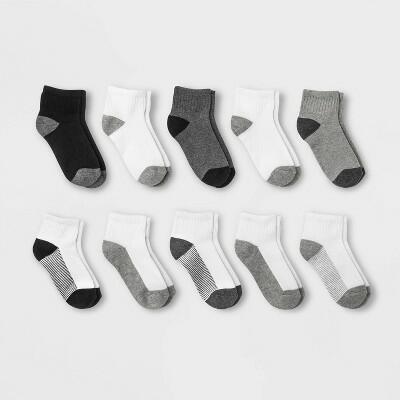 Keep her footwear comfortable with this 10-Pack Ankle Socks from Cat & Jack?. This multipack of ankle-cut socks makes a practical addition to her daily essentials. It features a mix of sporty stripes and colorblock designs in gray, black and white for fresh variety and an option to match every outfit. The soft and stretchy knit fabric provides comfy all-day wear, while the ribbed cuffs ensure a secure fit. She can pair them with sneakers and other casual shoes for versatile styling year-round.