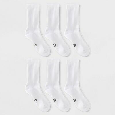 Why we're ALL IN: White six-pair pack of cushioned foundation athletic crew socks. Made from a moisture-wicking, midweight recycled polyester blend with spandex and ventilating mesh to help keep your feet cool and comfy. Reinforced toe and heel, arch support and zone cushioning provide an all-around comfortable fit. All in Motion?: Made for every move, priced for every day.